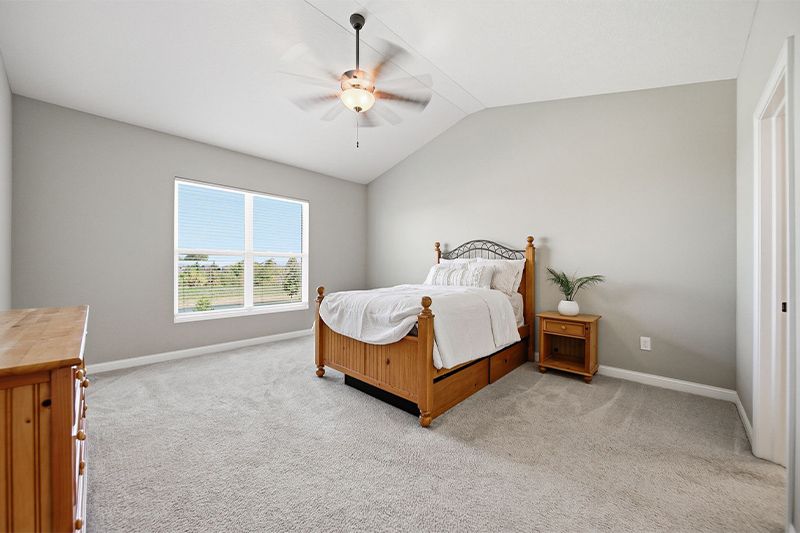 The primary suite sits quietly at the rear, cathedral ceiling above, pond view beyond. It’s spacious without feeling distant; a retreat that makes turning in early feel like self-care rather than a punishment.