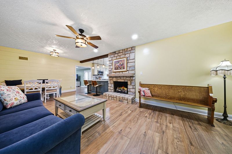 The front living room is cozy, the dining nook has a built-in bench tucked against the shiplap, and the stone fireplace anchors the whole space by pulling the kitchen, dining, and living areas together. Then the family room opens up through the barn doors, featuring another fireplace, sage green walls, and plenty of room for everyone. When the house fills up with guests, it can spill out onto the covered deck, and when it empties out at night, it still feels just right. That's the test of a good layout... it works at every volume.