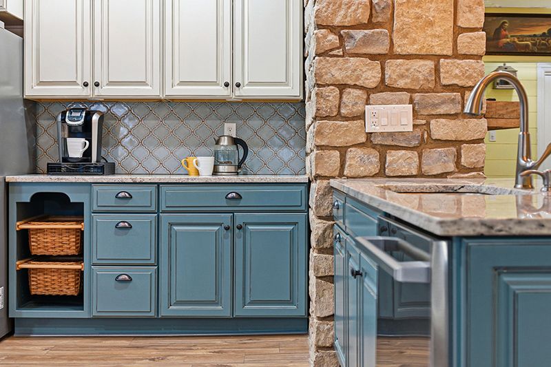 Two-tone cabinetry with teal lowers and cream uppers. Arabesque tile backsplash. Quartz counters and a pot filler at the stove. Glass-front cabinets that catch the light. This isn't a kitchen that got "updated" — it got considered. And it's big and open enough for the way people actually gather, which is everyone ending up in the kitchen anyway.